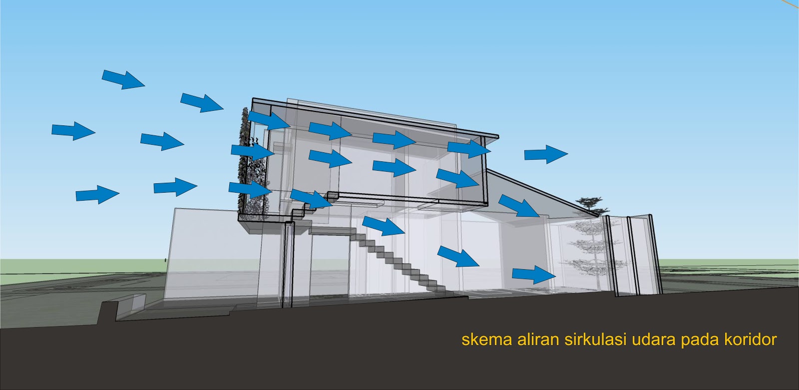 koridor berfungsi sebagai sirkulasi dari dan ke lantai 2. selain itu koridor juga berfungsi mengalirkan udara dari dan ke luar bangunan rumah .